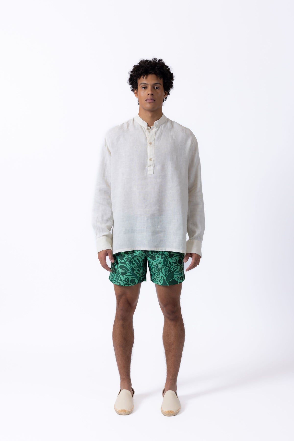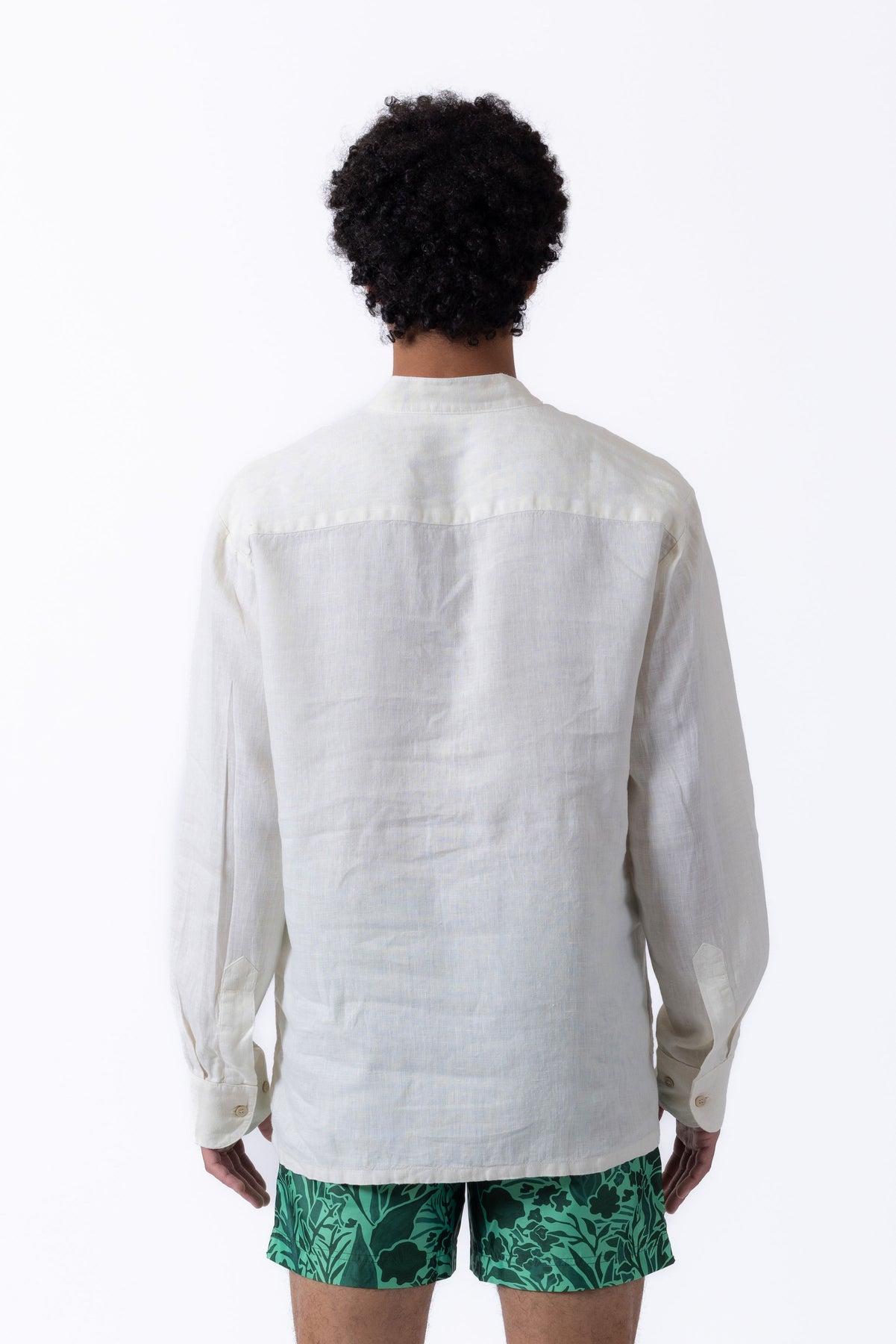 An elevated take on the men's linen shirt, cut from 100% Portuguese linen for breathability and comfort. The Edward features a relaxed long-sleeve silhouette with a band collar and clean placket, perfect for refined resort and effortless summer dressing.