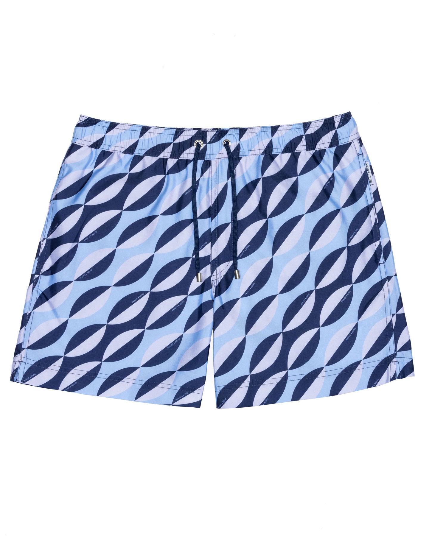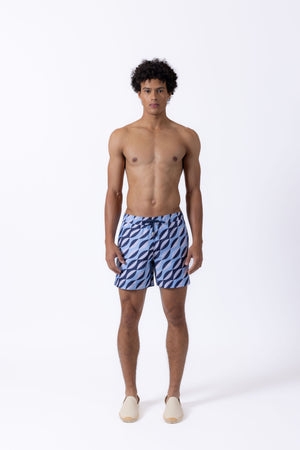 Inspired by the iconic Hotel Dei Principe designed by renowned artist Mario Gio Ponti. Printed with white and blue geometric tile print that mirrors the hotel's exquisite flooring, these shorts exude a retro charm and a nautical allure. Step into a world of sophistication and style, as you are transported to the picturesque shores of Sorrento where this luxurious hotel stands majestic.
