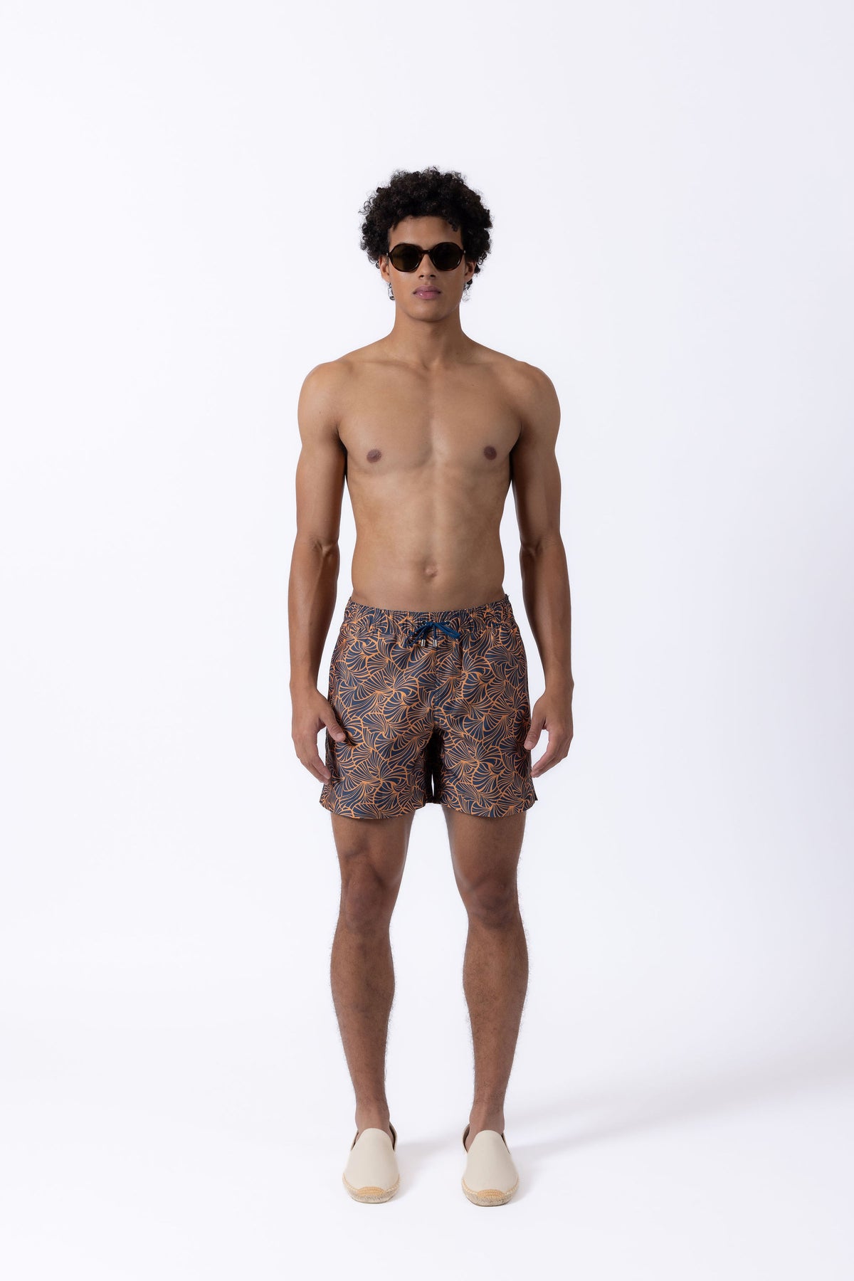 Inspired by the vibrant landscape and Culture of Rio De Janeiro, these swim shorts are cut in a tailored silhouette and designed with an elasticated waistband, our 5 inch inseam swim short  is a refined take on the classic swim shorts.