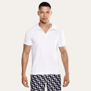 Cut from ultra-soft , breathable terry cloth and finished with an open placket, this polo brings a subtle touch of 60's Riviera glamour to your wardrobe . It's the piece you'll throw on after a swim, for a seaside lunch, or to elevate an easy summer evening look. Sustainably and ethically crafted in Portugal. Pair with matching Rivera terry shorts to complete the look.