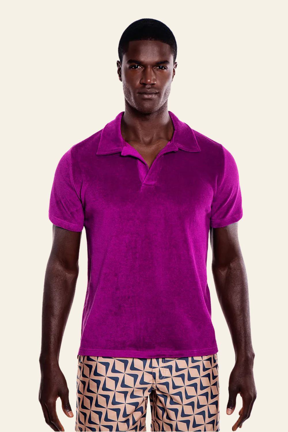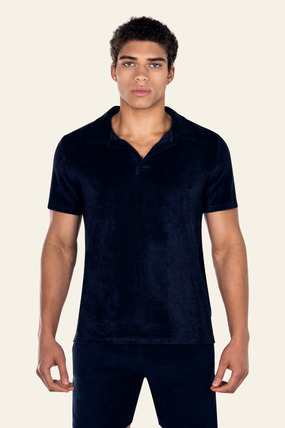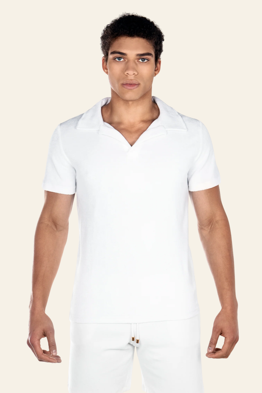 Cut from ultra-soft , breathable terry cloth and finished with an open placket, this polo brings a subtle touch of 60's Riviera glamour to your wardrobe . It's the piece you'll throw on after a swim, for a seaside lunch, or to elevate an easy summer evening look. Sustainably and ethically crafted in Portugal.