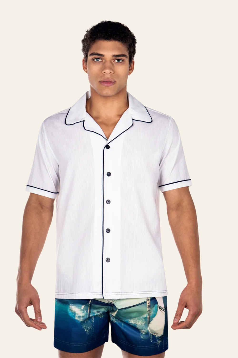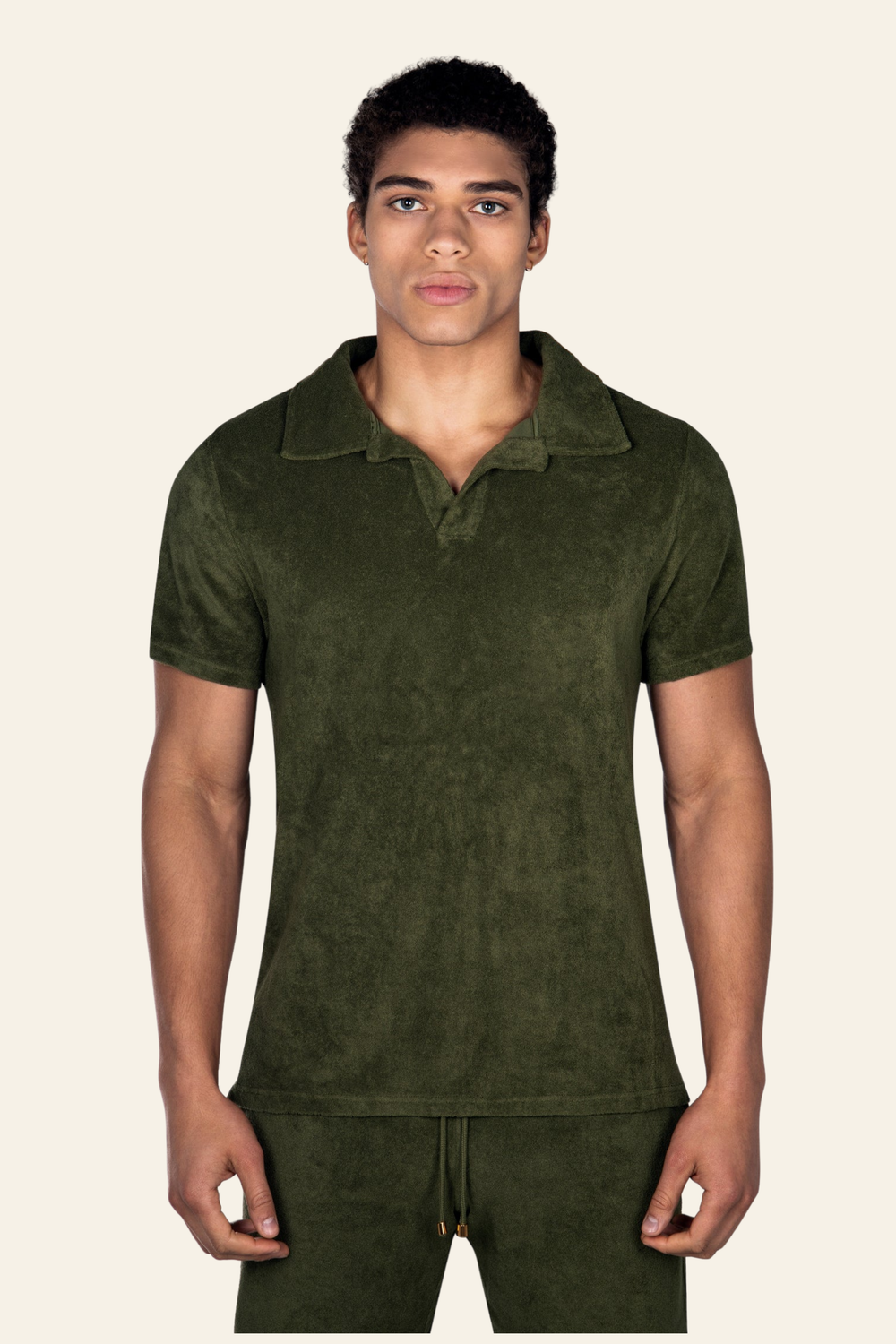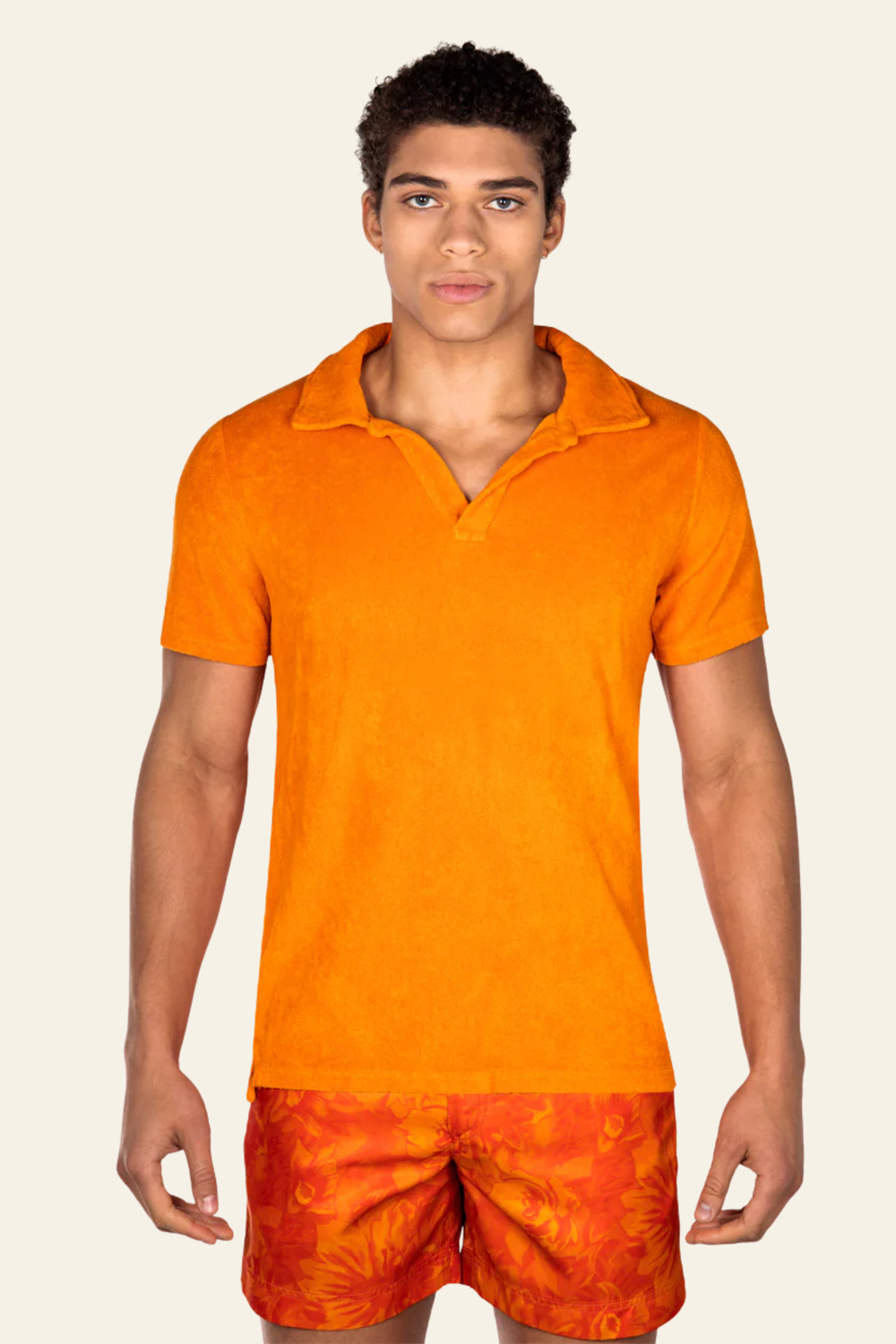 Cut from ultra-soft , breathable terry cloth and finished with an open placket, this polo brings a subtle touch of 60's Riviera glamour to your wardrobe . It's the piece you'll throw on after a swim, for a seaside lunch, or to elevate an easy summer evening look. Sustainably and ethically crafted in Portugal.